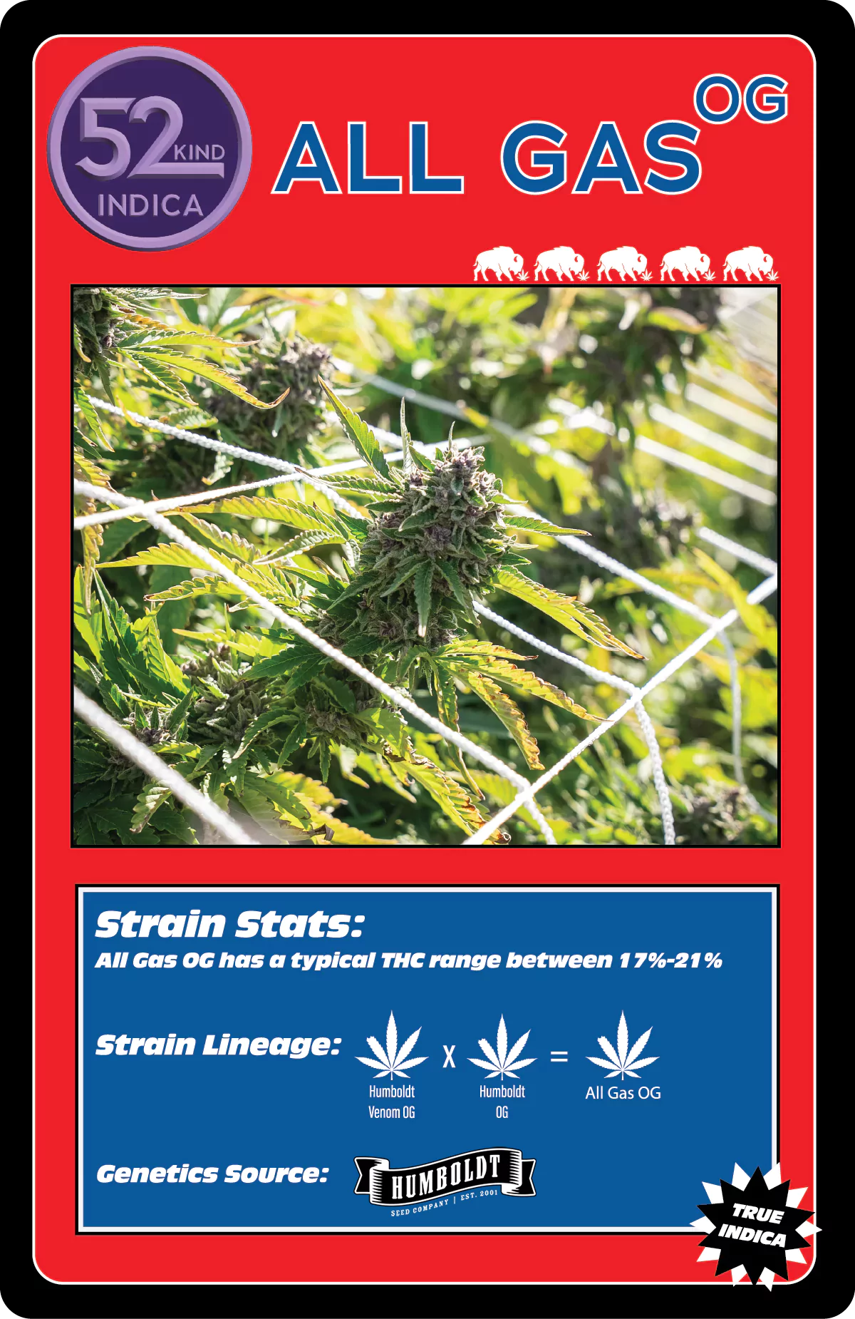 All Gas OG is named for the pungent fuel aroma that fills the air whenever you open a pack. The tell-tale scent is an indication of the exotic flavor profile. Inhaling the smoke offers an amazing combination of pine and diesel notes with a lovely, subtle, earthy undertone. The piney-orange flavor is quite unique and introduces a nice complexity to the strain. Ideal for evening use, the effects of All Gas OG are true to indica expectations, melting away stress and delivering a sense of relaxation and euphoria.
