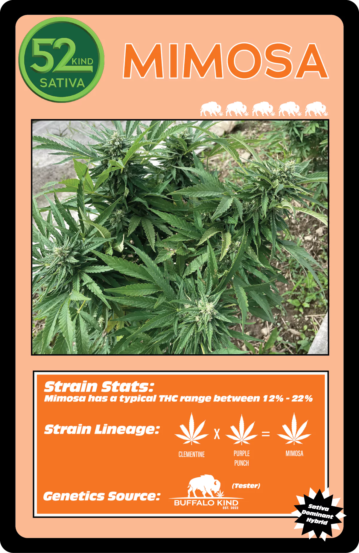 Buffalo Kind continues to innovate our processes and pioneer exceptional cannabis strains. For an invigorating experience, consider Mimosa. A sativa-dominant cannabis opportunity, it blends earthy herbal notes, citrusy freshness, piney undertones, and light hints of peppery spice. It’s a fantastic choice for both therapeutic potential and recreational enjoyment. Whether you’re looking for a mood boost, improved focus, or inspiration, the moderate THC content of 13.92 % and minimal CBD content of 0.07% are ideal.